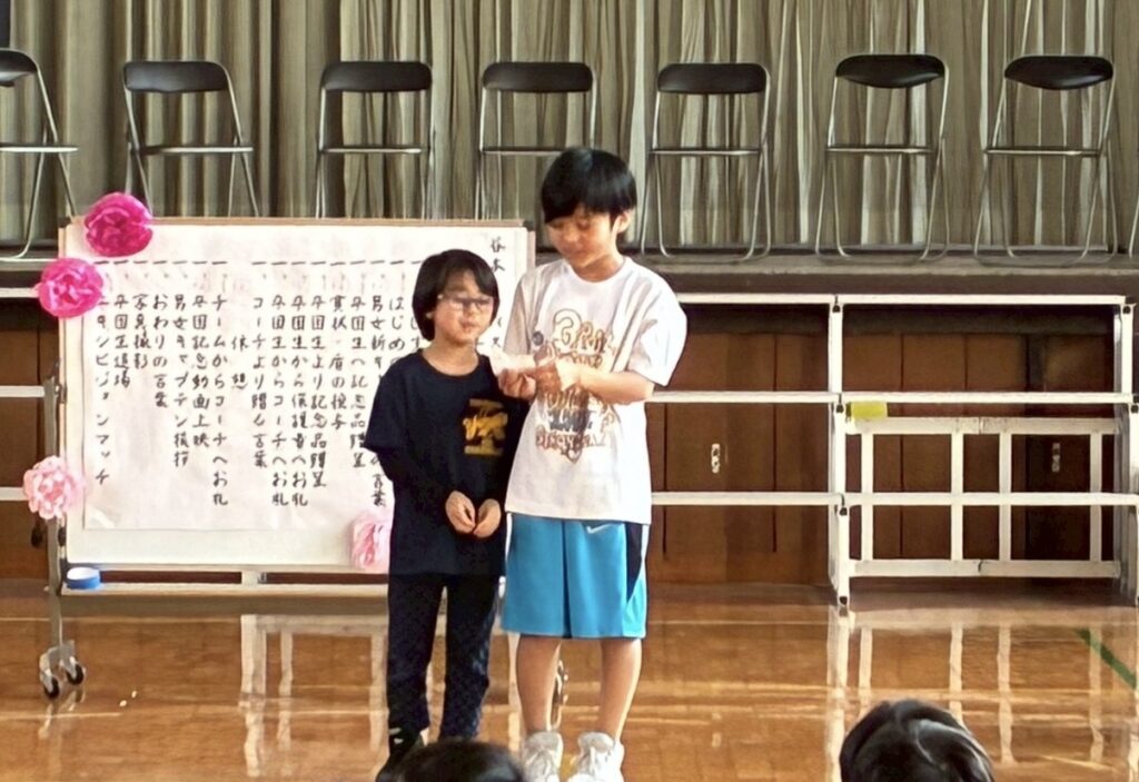6年生へのプレゼントでは、お世話になった5年生から一人ひとり手渡しで受け取りました。名前の入ったタンブラーやフォトブック、そして心のこもった寄せ書きと、どれも思いが詰まった贈り物ばかりです。学年を越えて受け継がれてきたつながりや、5年生以下のメンバーの「ありがとう」の気持ちがしっかりと伝わってきました。