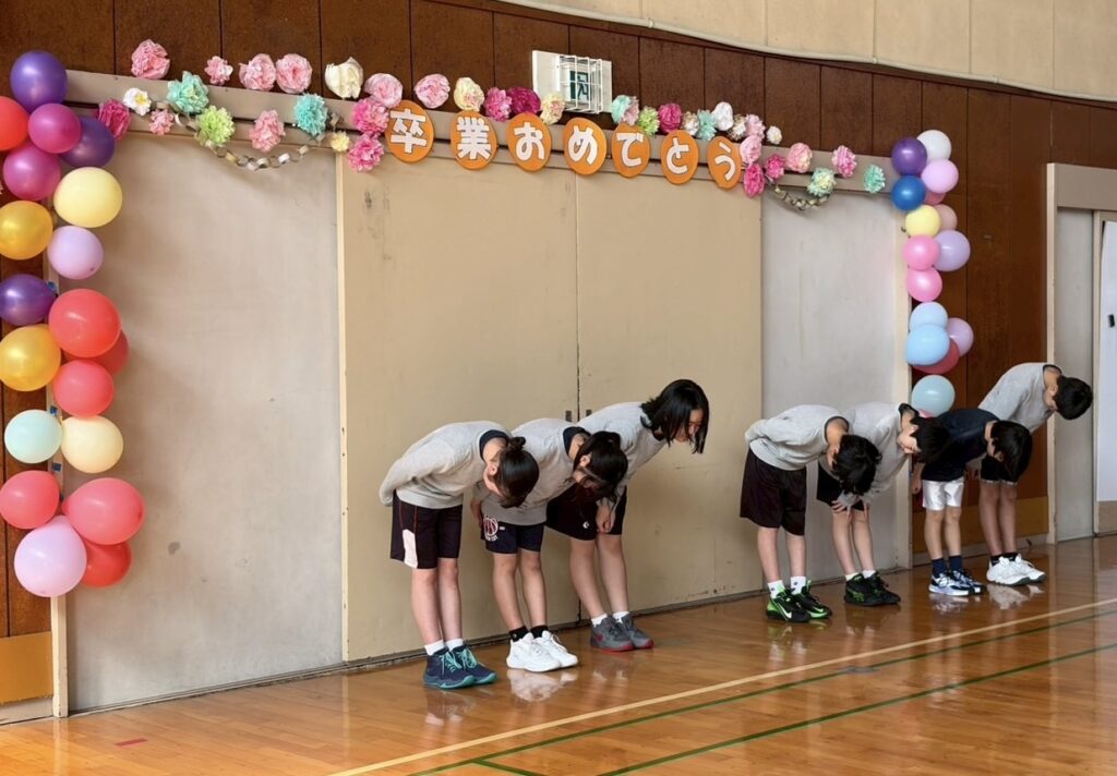 その後、みんなで花道を作り、6年生を送り出しました。拍手に包まれながら進む姿はとても晴れやかで、それでいてどこか名残惜しさも感じます。最後は6年生が体育館に向かってお世話になった体育館とすべての人へ感謝を伝え、深く一礼して退場しました。